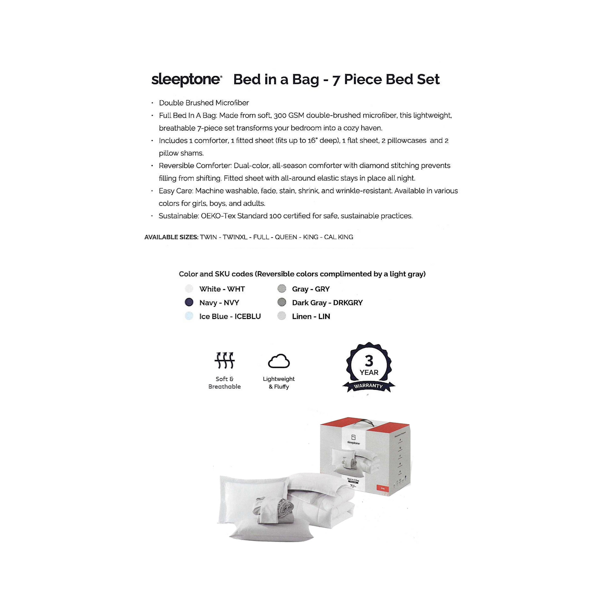 Discover our 7-Piece Bed-in-a-Bag Bedding Set - the ultimate choice for both comfort and style. Made from luxurious 300 GSM double-brushed microfiber, this lightweight and breathable set instantly transforms your bedroom into a cozy sanctuary. Included is a comforter, fitted sheet (fits up to 16" deep), flat sheet, 2 pillowcases, and 2 pillow shams. The reversible comforter features a dual color design (each color complemented by a light gray) and diamond stitching to prevent filling from shifting. The fitted sheet has all-around elastic to ensure it stays in place all night. Plus, this set is incredibly easy to care for - simply machine washable and resistant to fading, stains, shrinking, and wrinkles. Available in a variety of colors for people of all ages and sizes and sustainably made with OEKO-Tex® Standard 100 certification. Choose from two elegant styles to enhance your bedroom decor.