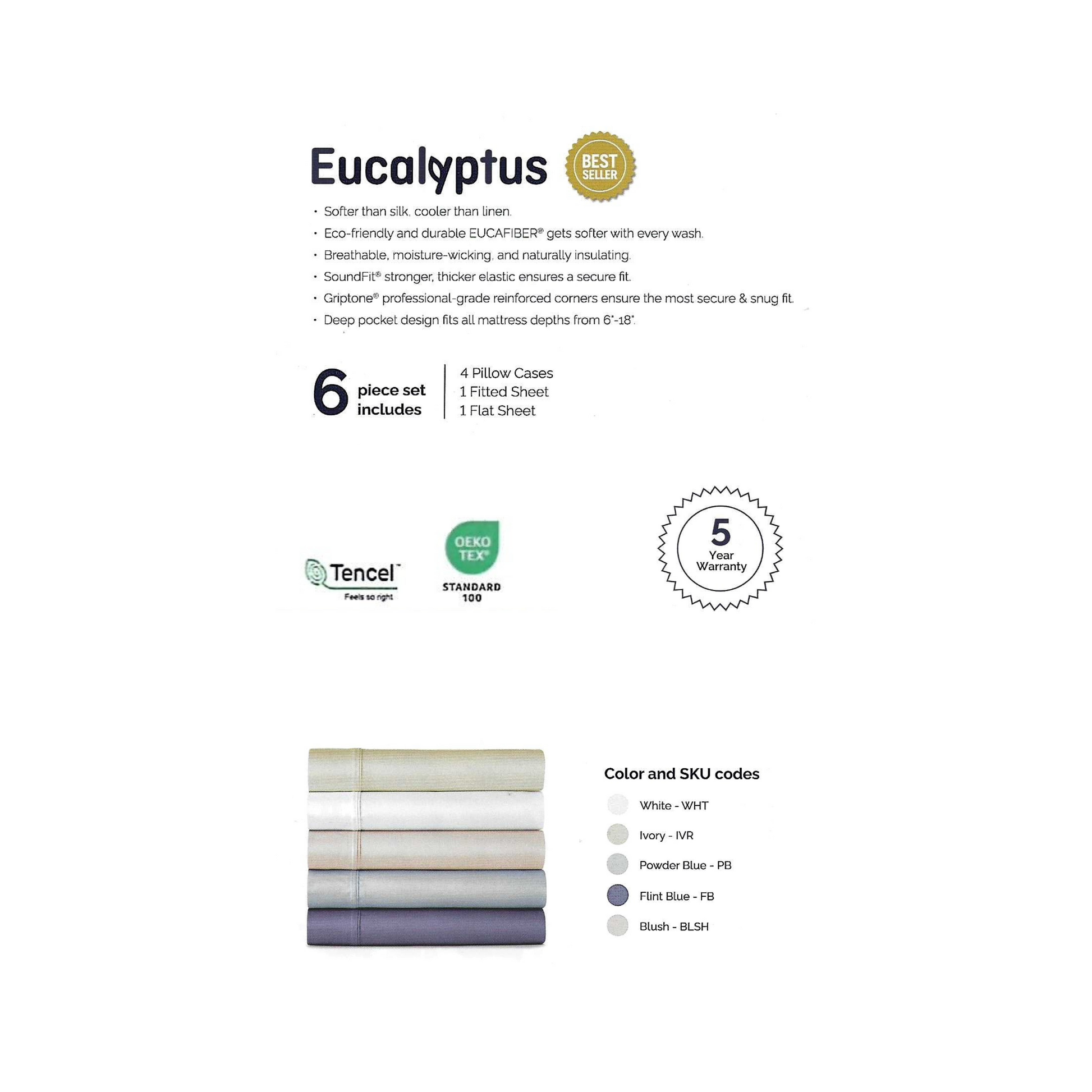 Indulge in sustainable luxury with our Eucalyptus 6-Piece Sheet Set, offering silk-like softness with superior moisture-wicking capabilities for consistently dry comfort. The natural thermoregulation of eucalyptus fibers creates an ideal sleep environment—cooling in heat and insulating when cold. These hypoallergenic sheets feature inherent antimicrobial properties that inhibit bacteria and odor, making them perfect for sensitive individuals. Sourced from rapidly renewable eucalyptus trees requiring minimal water and pesticides, and manufactured using closed-loop technology, these sheets represent an environmentally responsible choice. The exceptional durability of TENCEL® fibers ensures resistance to pilling, shrinking, and wrinkling, maintaining quality and appearance with proper care. TENCEL® is a trademark of LENZING®.