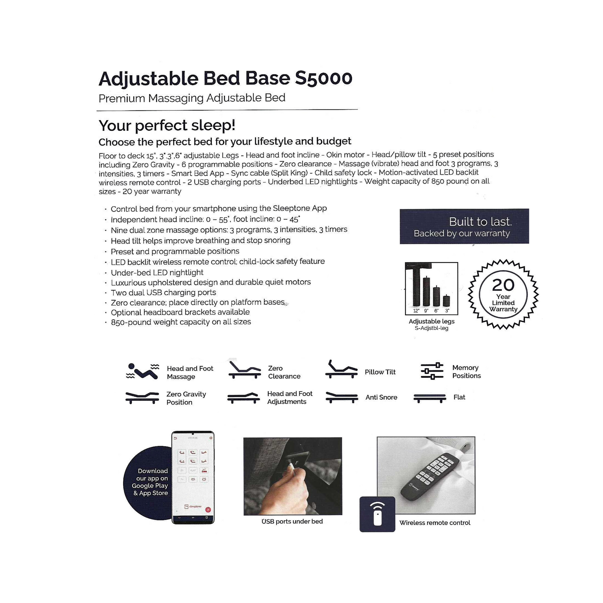 The S5000 Premium Massaging Adjustable Base features a 20-year warranty and a weight capacity of 850 pounds across all sizes. Its floor to deck height is 15" with adjustable legs of 3", 3", and 6" for customizable incline of the head and foot. The base is equipped with an Okin motor, head and pillow tilt, and USB ports on both sides. It also includes a remote, 5 preset positions (including Zero Gravity), and 6 programmable positions. The massage function offers 4 programs, 3 intensities, and 3 timers, with the option of controlling it through a Bluetooth app or a motion-activated LED backlit wireless remote. For added safety, the base has a child safety lock, under-bed LED nightlights, and a zero-clearance design.